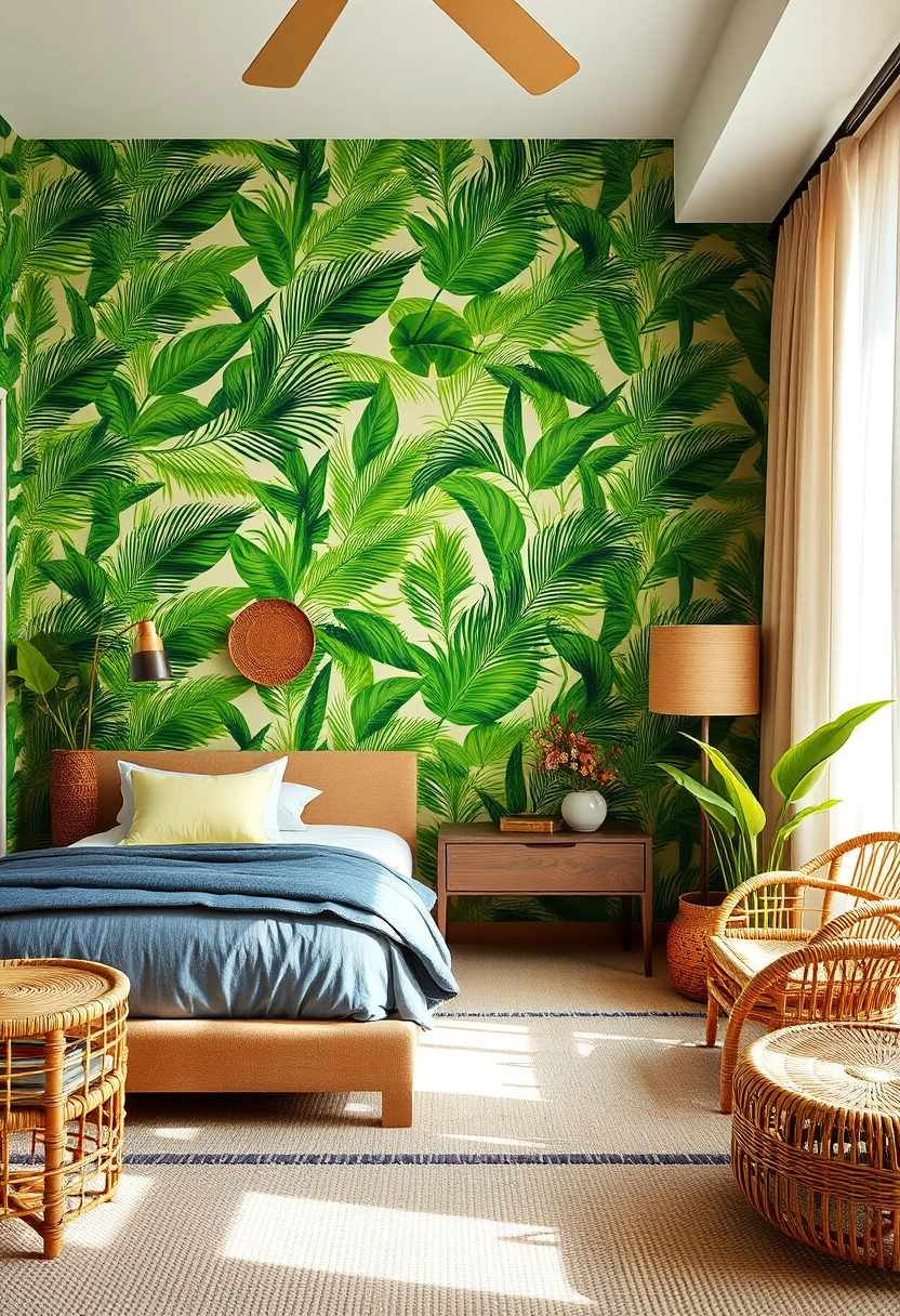 Step into a sunroom that captures the essence of coastal living. The corner accent wall features large botanical wallpaper that brings the outdoors in, while rattan furniture adds a touch of beachy charm.
